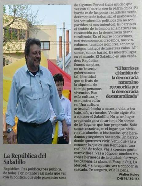 República, Res pública,cosa pública, de todos. Por lo tanto casi nada que ver con la política, que sólo parece ser cosa de algunos. Pero sí tiene mucho que ver con el barrio, con la patria chica. El barrio es de las pocas realidades verdaderamente de todos, sin el manoseo de los contubernios políticos (ya no son partidos ni movimientos). El barrio es el ámbito de la democracia natural no reconocida por la democracia desnaturalizada. En el barrio convivimos, nos reconocemos, crecemos, nos vinculamos, tenemos nombres, tenemos amigos, testigos de nuestras vidas. Allí somos, somos barrio. Es nuestro lugar en el mundo. El Saladillo es una verdadera República. Somos nosotros, no un invento gubernamental. Identidad que es fruto de la alquimia de tiempo, personas, vivencias. Eso es la cultura, y es nuestra cultura. Una cultura artesanal, hecha a mano, a vida, a trabajo, a fe, a vínculos. Venite algún día a conocer el Saladillo. No es un lugar preparado para el turismo. No somos de los lugares que han preparado. Sólo somos nosotros, es el lugar que hicieron los abuelos, o bisabuelos, que heredamos y seguimos haciendo. Un barrio donde queremos vivir. Vení, que vas a conocer lo que es una República, una realidad de todos. Vas a conocer gente maravillosa. Vas a conocer muchos rincones hermosos de la ciudad: el arroyo, las casonas, la plaza, el Parque Sur, La Merced, y si te apurás, vas a conocer la cascada. Te aseguro, vale la pena.