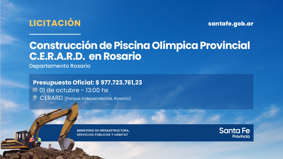 El Ministerio de Infraestructura, Servicios Públicos y Hábitat, a través de la Secretaría de Arquitectura y Obras Públicas, licitará las obras de construcción de piscina olímpica en el Complejo Educativo, Recreativo y de Alto Rendimiento Deportivo (C.E.R.A.R.D) de la ciudad de Rosario.
